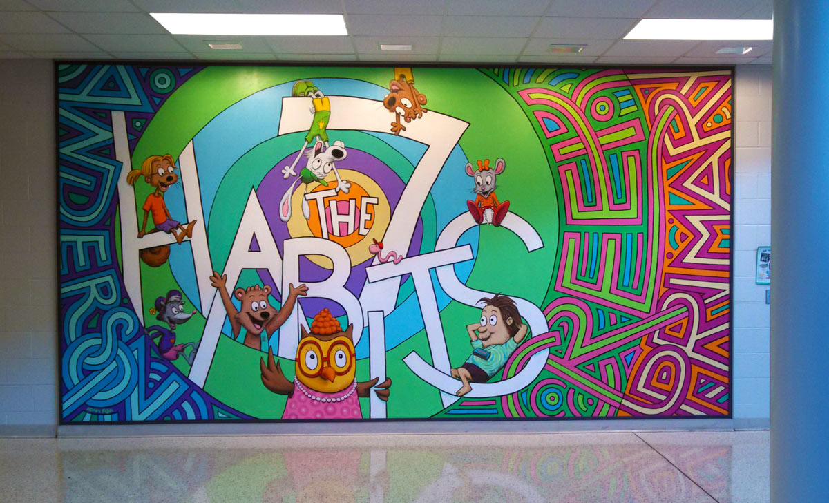 A mural painted for the main entrance of the school showing the school name and 7 Habits philosophy adopted by the school.